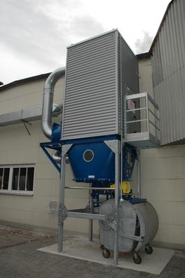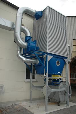 Bei der Anlage handelt es sich um eine Reinluftanlage mit separat aufgestelltem Ventilator in einer Schallschutzkabine. Die Filteranlage hat einen kleinen Puffer mit Rundaustragung. Das Material wird über eine Förderschnecke in einen 1.100 l Behälter transportiert. An dieser Stelle soll zu einem späteren Zeitpunkt eine Brikettierpresse untergebaut werden.