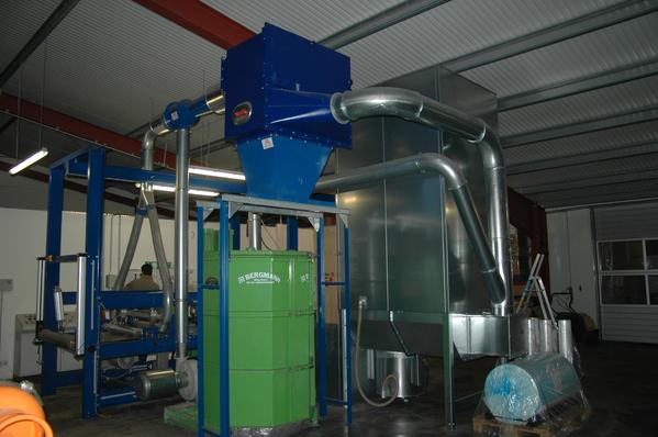Mittels eines Hochdruckventilators mit 75 kW Antriebsleistung werden die 15 Maschinen mit Stanzabfällen und Randstreifen abgesaugt und dem Materialabscheider zugeführt. Die Randstreifen laufen über Rohrcutter, wo diese zerkleinert und dem Materialabscheider zugeführt werden.